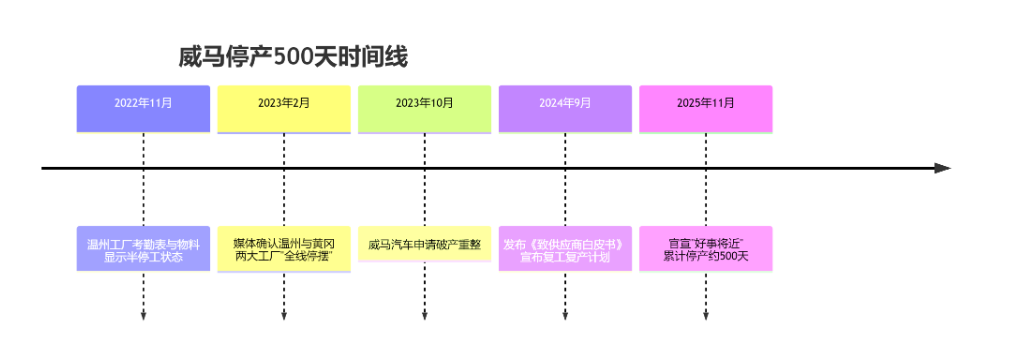 2022年12月,有消息稱,由于拖欠供應(yīng)商貨款,威馬工廠已陷入停產(chǎn)狀態(tài)。一位當?shù)厝耸客嘎叮骸艾F(xiàn)在溫州工廠里都沒人了。”