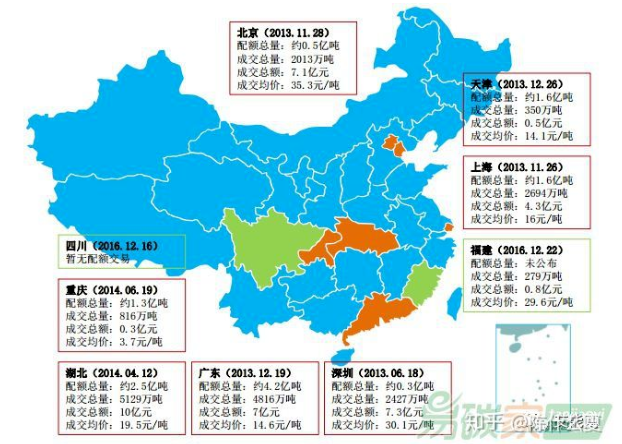 試點階段進行碳配額交易,交易品種為地方配額現(xiàn)貨和中國核證減排量(ccer)現(xiàn)貨,以地方配額為主導。2011年起,先后在北京市、天津市、上海市、重慶市、廣東省、湖北省、深圳市啟動7個碳交易試點。7個試點啟動以來,碳交易市場十分活躍,截止到2017年12月31日,七省市試點碳市場及福建碳市場配額累計成交量為1.85億噸。