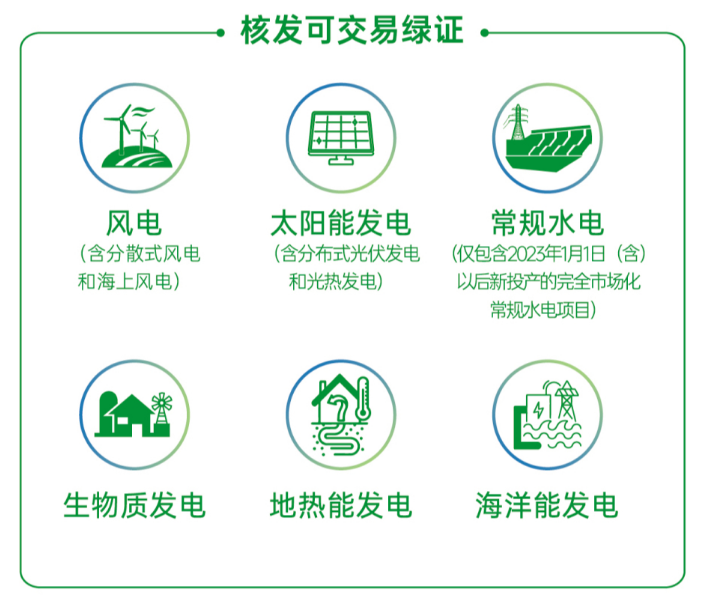 將可再生能源綠色電力證書(shū)(綠證)核發(fā)范圍從陸上風(fēng)電和集中式光伏發(fā)電項(xiàng)目擴(kuò)展到所有已建檔立卡的可再生能源發(fā)電項(xiàng)目,實(shí)現(xiàn)綠證核發(fā)全覆蓋。核發(fā)范圍如下圖所示: