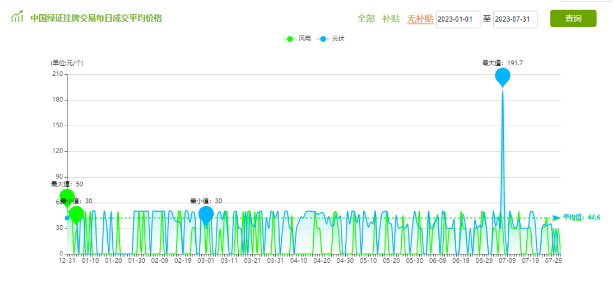 根據(jù)綠證認(rèn)購(gòu)平臺(tái)-統(tǒng)計(jì)數(shù)據(jù)版塊顯示,目前,風(fēng)電、光伏的無(wú)補(bǔ)貼綠證的交易價(jià)格集中在30~50元/張。2023年1~7月的平均交易價(jià)格為42.4元/張。