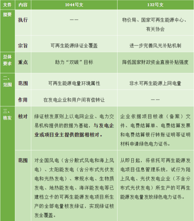 《關(guān)于做好可再生能源綠色電力證書(shū)全覆蓋工作促進(jìn)可再生能源電力消費(fèi)的通知(發(fā)改能源〔2023〕1044號(hào))》與《關(guān)于試行可再生能源綠色電力證書(shū)核發(fā)及自愿認(rèn)購(gòu)交易制度的通知(發(fā)改能源〔2017〕132號(hào))》相比有什么具體變化?小編進(jìn)行了綜合整理,詳情見(jiàn)下表。