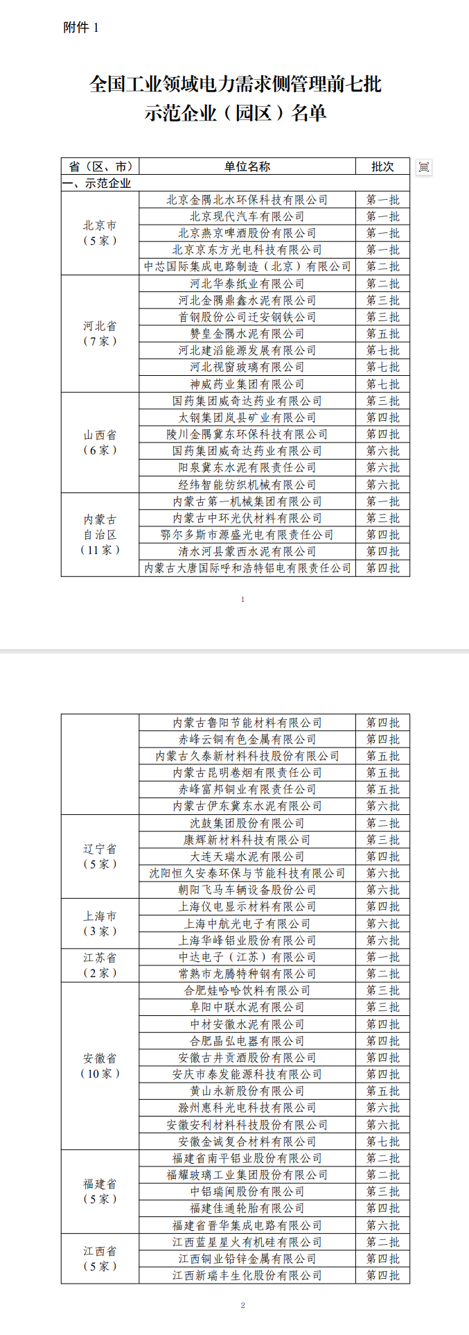 附件:1.全國工業領域電力需求側管理前七批示范企業(園區)名單