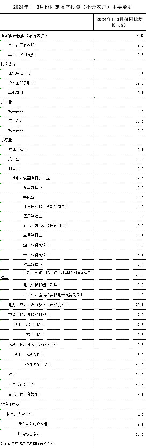 2024年1—3月份,全國(guó)固定資產(chǎn)投資(不含農(nóng)戶(hù))100042億元,同比增長(zhǎng)4.5%(按可比口徑計(jì)算,詳見(jiàn)附注7),增速比1—2月份加快0.3個(gè)百分點(diǎn)。其中,制造業(yè)投資增長(zhǎng)9.9%,增速加快0.5個(gè)百分點(diǎn);基礎(chǔ)設(shè)施投資(不含電力、熱力、燃?xì)饧八a(chǎn)和供應(yīng)業(yè))增長(zhǎng)6.5%,增速加快0.2個(gè)百分點(diǎn)。從環(huán)比看,3月份固定資產(chǎn)投資(不含農(nóng)戶(hù))增長(zhǎng)0.14%。2024年1—3月份,民間固定資產(chǎn)投資51597億元,同比增長(zhǎng)0.5%。