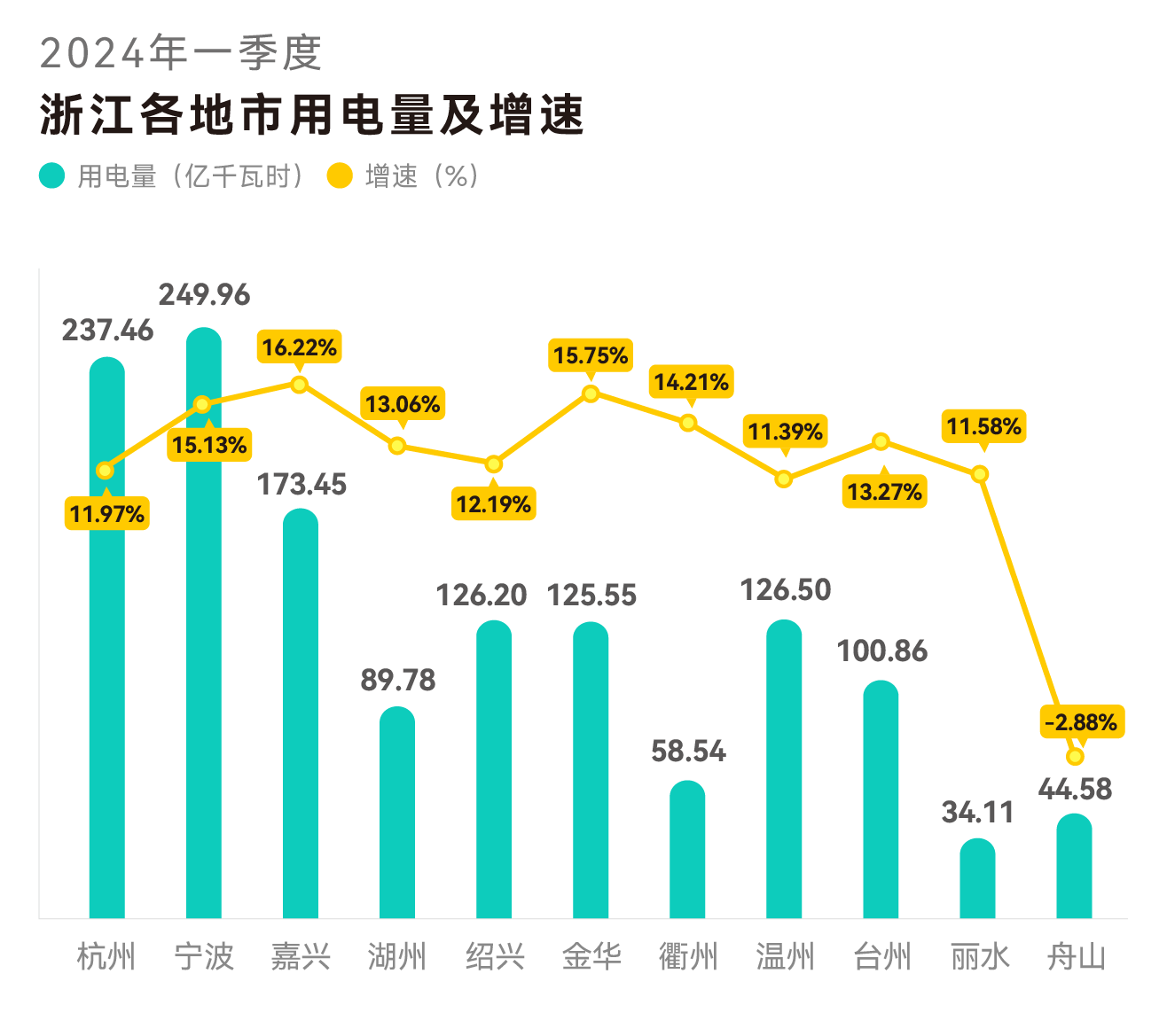 分地區來看,一季度浙江累計用電呈現“十正一負”。除舟山外,其余地市用電量均為正增長,嘉興以16.22%的增速領跑11市。