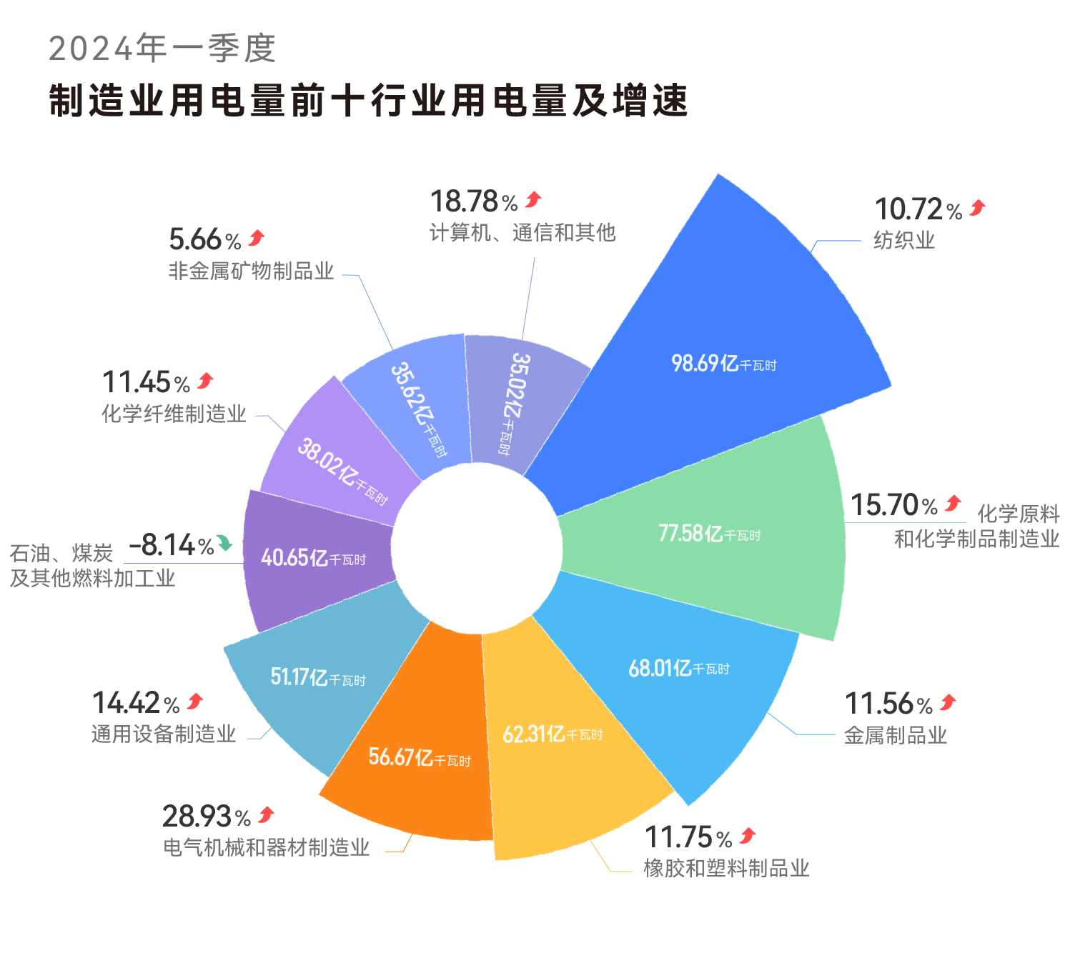 體量最大的“紡織業”用電98.69億千瓦時,增速10.72%,相比2023年同期實現由負轉正,延續了去年四季度以來的良好態勢。制造業中,高新技術及裝備制造業增速18.25%,在制造業增量中貢獻度達46.5%,是2024年一季度浙江制造業增長的主要動力來源。