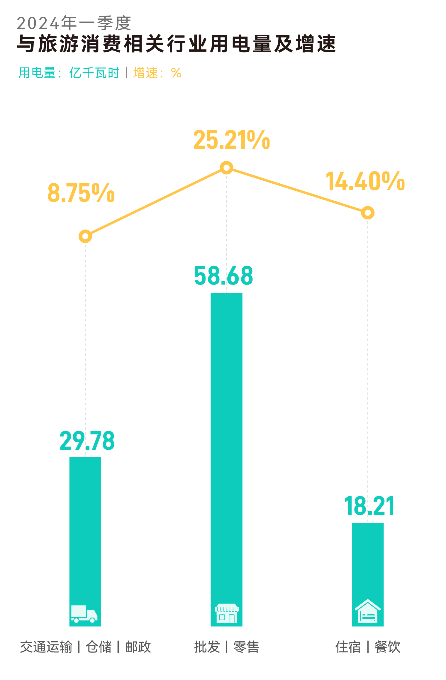 旅游業及相關消費需求釋放推動用電量增長,交通運輸、倉儲和郵政業用電量同比增長8.75%。